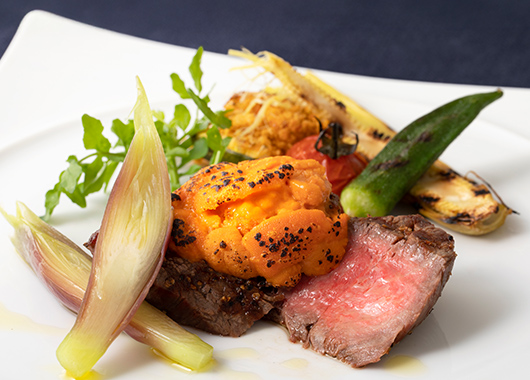 その中でも年間を通しておすすめする一皿は、キャビアと雲丹の冷製カッペリーニ、飛騨牛シャトーブリアンのグリルです。