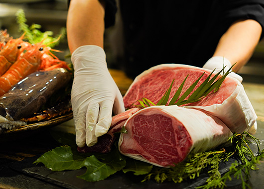 食材を目の前にご覧いただきながら、店舗スタッフがご説明、プレゼンを行いお好みの食材、調理法をお好きなだけ頼んでいただけます。